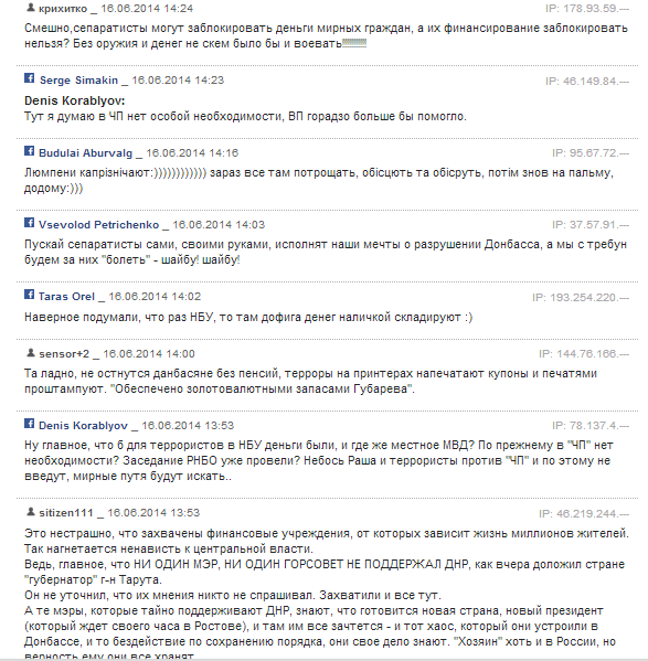- Смешно, сепаратисты могут заблокировать деньги мирных граждан, а их финансирование заблокировать нельзя? Без оружия и денег не с кем было бы и воевать!