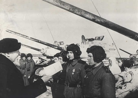 Фотофакт: Митрополит Николай (Ярушевич) передает на фронт танковую колонну имени Дмитрия Донского, созданную на средства Русской Православной Церкви.