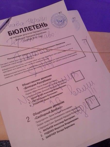 На бланке для голосования избиратель, выложивший затем изображение в глобальную сеть, написал свое отношение к «народным республикам». Также в тексте содержится предупреждение, адресованное боевикам. Избиратель сообщил, что за представителями незаконным вооруженных формирований уже идет украинская армия.