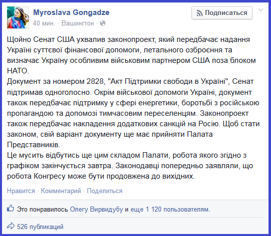 Новостью о принятии закона в Сенате поделились Мирослава Гонгадзе и Семен Семенченко, который недавно с визитом посещал США.
