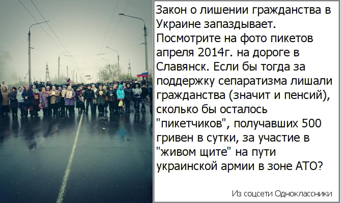 "Закон явно запоздал", - считают эксперты. Сколько обманутыми сепаратистами "дедушек и бабушек" и молодежи, получавших от 500 гривен до 200 долларов США в сутки за участие в "живом щите" на пути украинской армии в зоне АТО можно было бы остановить, отделив организаторов акций протеста от обычных жителей, решивших заработать на преступлении еще более страшном по УК Украины, чем убийство или грабеж.