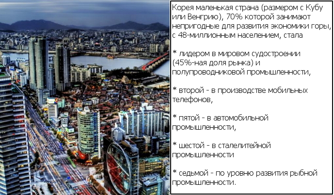 а) сотни тысяч южнокорейцев принудительно привозили из сел в города, где заставляли работать по 14 часов в сутки буквально за чашку риса, затем зарплата росла, и сейчас ВВП на душу населения составляет более 30 тыс. долларов в год;