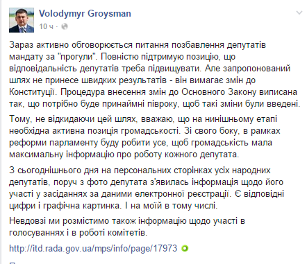 Председателем Верховной Рады Украины Владимиром Гройсманом было сделано заявление о том, что для принятия решения о введении процедуры лишения народных депутатов их мандатов за «прогулы» пленарных заседаний украинского парламента потребует как минимум полгода. Однако, по словам спикера украинского парламента, начиная со вчерашнего дня, на официальном сайте Верховной Рады будет регулярно публиковаться информация, касающаяся участии каждого народного депутата в пленарных заседаниях парламента. Такая информация была обнародована спикером украинского парламента на своей странице в «Фейсбук» в среду.