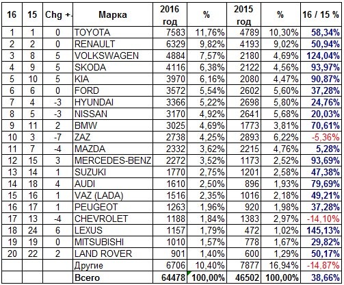 Наиболее часто украинцы в ушедшем году приобретали автомобили марки Toyota – 7 583 купленных машины, что составляет 11,76% от общего объема автомобильных приобретений. Этот показатель на 1,46% больше, нежели в 2015 году, когда авто данной японской компании в Украине было продано 4 789 единиц (10,30%).