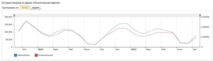 Сервис Яндекса wordstat.yandex.ru позволяет определить, какая именно информация интересует россиян при вводе в Яндексе слова "политическая партия":