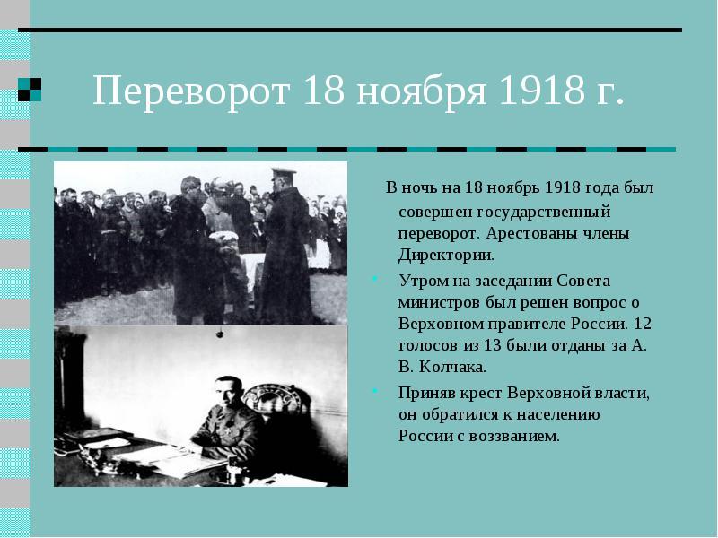 1. Приход к власти в России Колчака связывался многими россиянами с надеждой на "победу" и "мир". Закончилось кровью, хаосом и гражданской войной.