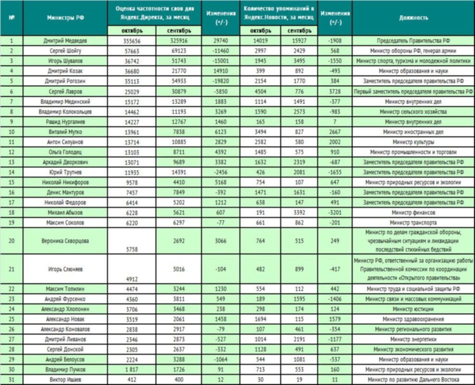 В таблицу вошли только те министры, о которых СМИ упоминали менее 1000 раз за последний месяц, что можно считать критической точкой для известных политических деятелей.