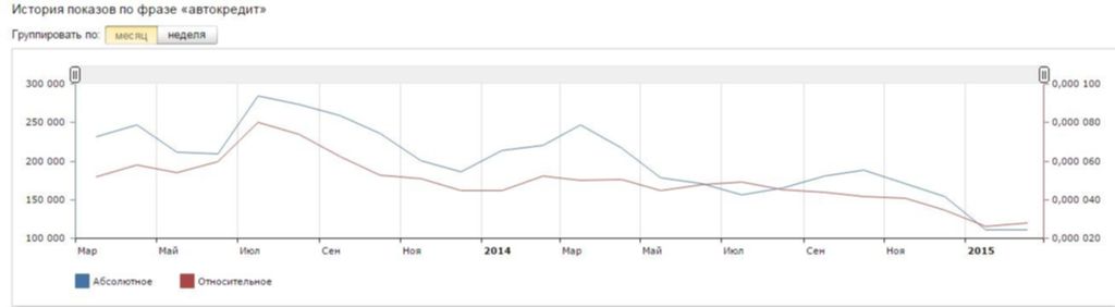 Благодаря сервису Яндекс.Директ аналитики "Биржевого лидера" последили интерес россиян к обобщающему запросу "автокредит" для более тщательного изучения данного вопроса.