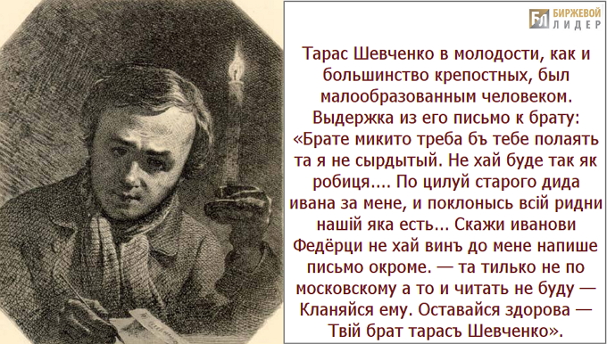 - Тарас Шевченко в молодости, как и большинство крепостных, был малообразованным человеком. Выдержка из его письмо к брату.